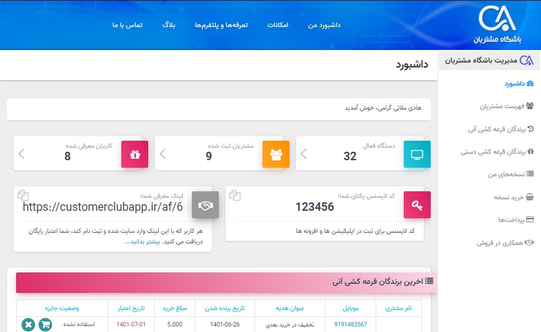 در صفحه داشبورد یک کادر لایسنس وجود دارد که برای ثبت در برنامه های اندرویدی و ویندوزی استفاده می شود.